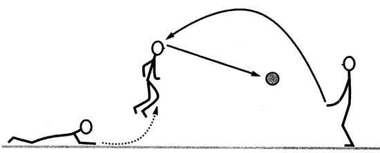 Организация и содержание: один игрок лежит на животе лицом к тренеру или другому (подающему), который стоит от него в 5-8 м с мячом в руках. Подающий подает сигнал: «Ап!» и снизу рукой накидывает мяч по дуге с высокой траекторией, давая время лежащему игроку встать. Лежащий должен мгновенно среагировать на сигнал и подброс, подняться и ударом головы в прыжке направить мяч подающему. Упражнение повторяется заранее определенное число раз.