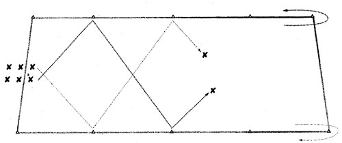 Организация и содержание: размечается площадка размером 40x15 м, по длинным сторонам которой на расстоянии 10 м друг от друга устанавливаются 10 стоек. Две колонны игроков становятся рядом в центре одной из лицевых (коротких) линий между двумя стойками. По команде тренера по одному игроку из каждой колонны бегут крест-накрест, пересекая дорогу друг другу, к ближайшим стойкам. Коснувшись стоек рукой, они устремляются к следующим. Центр площадки игроки должны пробегать одновременно. Достигнув последней стойки, игроки возвращаются (бегом) по внешним границам, становясь в хвост своих колонн, и в это время стартует следующая пара.