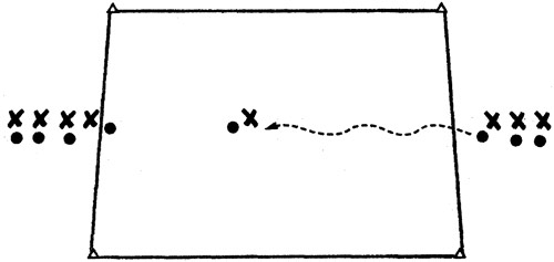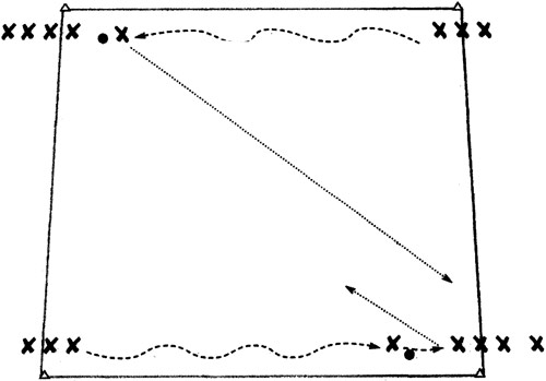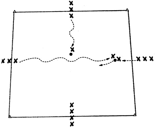 Организация и содержание: четыре колонны игроков располагаются крестообразно, на расстоянии 15-25 м друг от друга. Две смежные колонны имеют по мячу. Каждый игрок по очереди ведет мяч к противоположной колонне, где партнер подхватывает мяч и ведет его в обратном направлении. Выполняя упражнение, игроки должны избегать столкновения при ведении мяча на скорости.