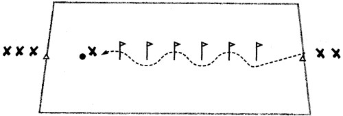 Организация и содержание: группа игроков разбивается на две колонны, которые соревнуются между собой в ведении слаломом по маршруту, размеченному флажками, установленными на расстоянии от 1 до 3 м. Каждая колонна разбивается еще на две части: одна половина - в одном конце слаломного отрезка, другая - в другом. Каждый игрок по очереди ведет мяч сквозь стойки способом, указанным тренером (одной ногой, попеременно или иным способом), после чего стартует партнер с другой стороны. Каждый должен провести мяч определенное количество раз. Команда, выполнившая упражнение первой, объявляется победительницей.