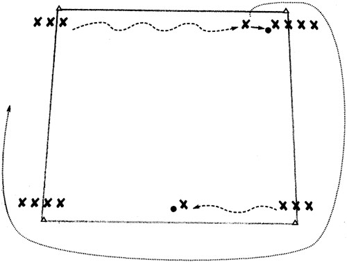 Организация и содержание: четыре колонны игроков выстраиваются по углам квадрата со стороной примерно в 20 м. Две колонны, стоящие по диагонали, имеют по мячу каждая. Игроки с мячами бегут в направлении колонн, у которых нет мячей. Игроки, передавшие мяч, бегут трусцой по периметру квадрата без мяча (здесь надо следить, чтобы они бежали по самому длинному пути), пока не достигнут своей первоначальной колонны.