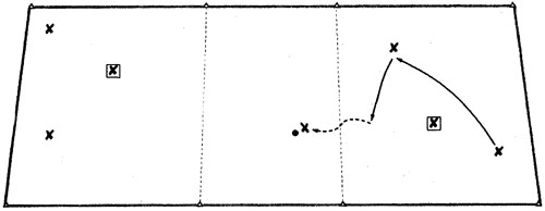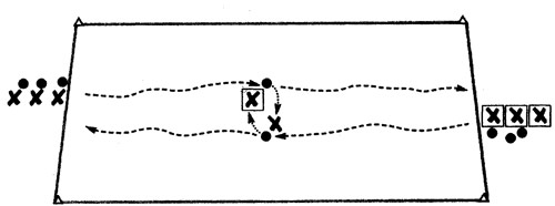 Организация и содержание: размечается площадка 40x15 м, по обеим сторонам которой дополнительно размечаются еще два 15-метровых квадрата. В одном из них действуют 4 игрока, где трое атакующих и один защитник. В другом квадрате - двое атакующих и один защитник. Один из атакующих в первом квадрате сразу начинает искать свободную зону для индивидуального прохода с мячом через среднюю зону в другой квадрат, чтобы подключиться к двум атакующим в том квадрате, и снова создать ситуацию трое против одного. Защитники не имеют права входить в среднюю зону. Нельзя делать и передачу в эту зону: входить туда можно только с ведением мяча или обводкой. Таким образом и продолжается это упражнение, когда один должен помочь двум другим в противоположном квадрате создать численное преимущество.