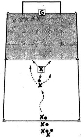 Организация и содержание: размечается коридор шириной 10-12 м и длиной 15-20 м. Вратарь занимает место в воротах лицом к колонне игроков, рядом с ним защитник, также находящийся лицом к этой колонне. У каждого атакующего - по мячу. Размечается также запретная для атаки зона в 6-8 м от ворот, в которую не имеет права входить и защитник. Игроки один за другим идут с мячом вперед, стремясь обыграть защитника с помощью обводки и поразить ворота.
