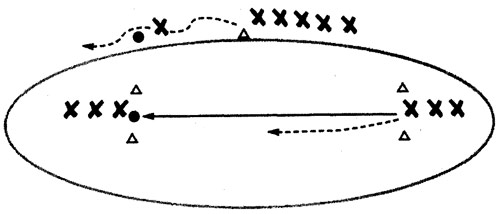 Организация и содержание: составляются две группы по 4-6 игроков. Одна строится в колонну и располагается за пределами центрального круга. Мяч - у направляющего. Другая группа разбивается на две колонны, стоящие лицом друг к другу на расстоянии примерно 15 м одна от другой, внутри круга. Стойки устанавливаются в 10 м по обеим сторонам от колонн, образуя таким образом коридор. По свистку тренера игроки вне круга по очереди ведут мяч по периметру на максимальной скорости. Тем временем игроки, находящиеся в круге, передают мяч пасом в противоположную колонну, забегая после передачи в ее хвост. Перед выполнением передачи остановка мяча обязательна. Однако каждый игрок может касаться мяча только после того, как он пересечет условную линию между стойками. Игроки в круге должны вести счет выполненным передачам, пока ведущие мяч снаружи не завершат свой круг.