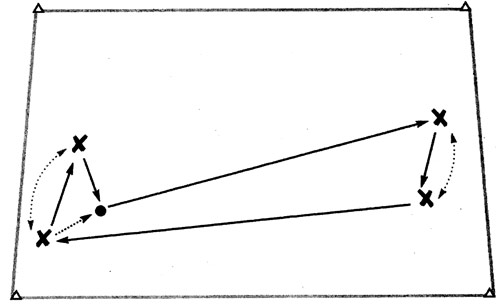 Организация и содержание: игроки располагаются парами в противоположных концах площадки размером 20x12 м. Игрок с мячом делает передачу одному из игроков в противоположном конце, который останавливает его для своего партнера по паре. Игрок, получивший мяч, отдает короткий пас в сторону под углом своему партнеру, а тот, в свою очередь, делает передачу игроку в дальний конец коридора. Игроки в парах взаимозаменяются после передач игрокам противоположной колонны и смотрят, как лучше сыграться друг с другом.
