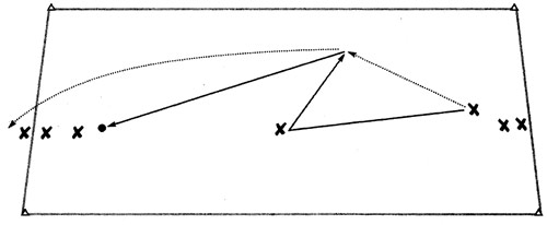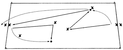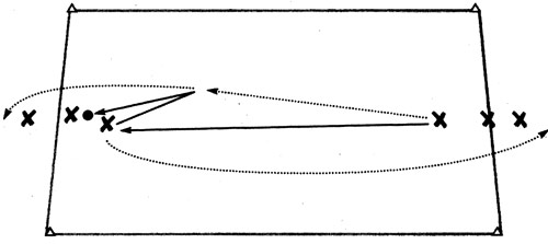 Организация и содержание: две колонны игроков стоят на разных концах площадки 30x15 м. Двое располагаются в середине. Первый игрок в обеих колоннах с мячом, который передает его одному из стоящих в середине, после чего открывается во фланг для получения ответного мягкого паса. Получив этот ответный пас, он дает пас вразрез следующему игроку в противоположной колонне и бежит в конец этой колонны. Тренер должен следить за тем, чтобы передачи, идущие от центральных, шли в одну и ту же сторону (влево или вправо от себя), что является залогом ритмичного выполнения упражнения.