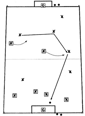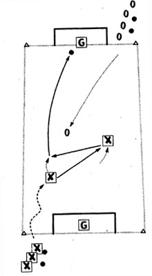 Организация и содержание: двое переносных ворот, защищаемых вратарями, устанавливаются на площадке 18x10 м. Две колонны игроков выстраиваются на противоположных концах по разные стороны ворот, у каждой колонны должно быть много мячей. Два игрока из одной колонны начинают движение с мячом. Одновременно от противоположной колонны стартует один игрок, действующий как защитник. Идет розыгрыш ситуации двое против одного, атакующие стремятся поразить ворота, защитник пытается не допустить этого. По завершении все возвращаются по своим колоннам, и все повторяется, но на этот раз атакующие представляют противоположную колонну. Упражнение выполняется попеременно.