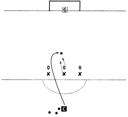 Организация и содержание: трое атакующих занимают позиции в штрафной площади лицом к тренеру, который располагается в 5-10 м от них с большим количеством мячей. Три защитника держат атакующих, но они играют лицом к воротам и не имеют права оглядываться и не видят мяча во время подачи. Тренер вбрасывает мяч либо сквозь скопление игроков, либо через их головы. Игроки, ближние к мячу, стремятся либо забить мяч, либо не допустить удара. У нападающих преимущество: они раньше видят мяч. Тренер подает следующий мяч после того, как все игроки вернутся в исходное положение.