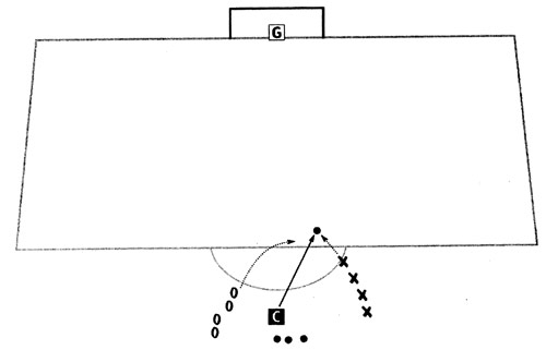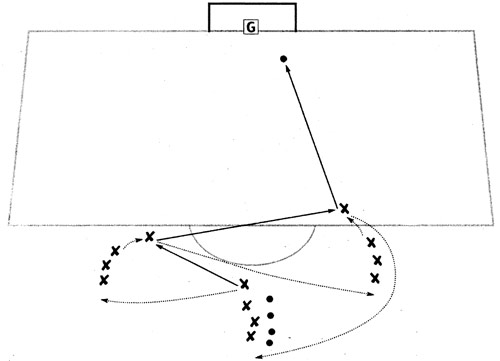 Организация и содержание: две колонны игроков, одна из которых - атакующие, другая - защитники, выстраиваются лицом к воротам и вратарю. Тренер стоит между двумя колоннами. Атакующие игроки, которые стоят на несколько метров ближе к линии штрафной получают преимущество. Тренер подает мяч самыми разными способами, защитники стремятся не допустить удара по воротам. Колонны меняются ролями, но атакующие всегда должны иметь позиционное преимущество.