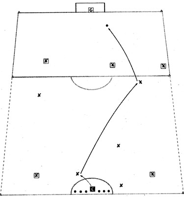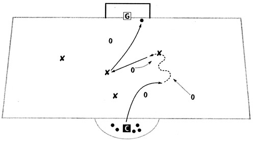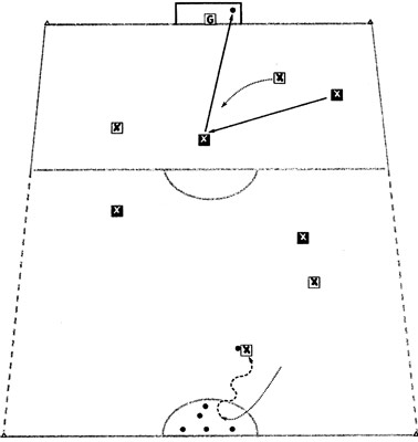 Организация и содержание: на футбольном поле размечается коридор с помощью линий, продолжающих боковые линии штрафной площади до средней линии поля. В штрафном круге устанавливается шесть мячей. Команды играют 4x4. Одна команда стремится нанести удар по воротам, другая -помешать этому. Как только атакующей команде удается нанести удар, другая сразу же отправляет одного игрока провести мяч и привести (подать) следующий мяч обратно. Теперь их очередь атаковать ворота.