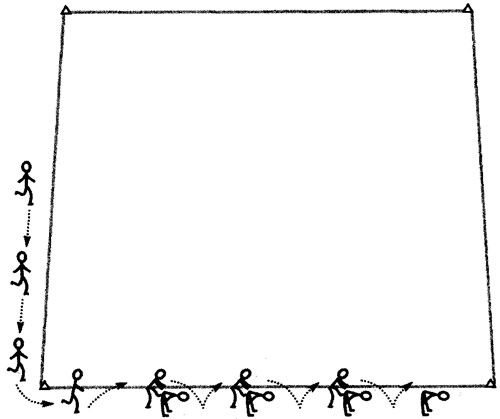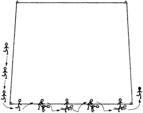 Организация и содержание: колонна игроков начинает бег трусцой по периметру квадрата 20x20 м. Дистанция 3-5 м. По свистку тренера направляющий останавливается, наклоняется вперед, ноги врозь, руками упирается в колени для устойчивости. Он должен помнить о глубине наклона, чтобы его можно было перепрыгнуть. Следующий за ним прыгает с упором руками в спину лягушкой и сам подставляет спину таким же наклоном вперед. Эта передвижная чехарда продолжается до тех пор, пока направляющий не вернется в свою исходную позицию впереди колонны. После этого все продолжают бег трусцой по периметру до следующего свистка тренера. Тренер варьирует дистанцию бега в зависимости от уровня физической готовности группы и продолжительности разминки или подводящих упражнений. Необходимо следить за тем, чтобы ребята покрупнее не прыгали через щуплых.