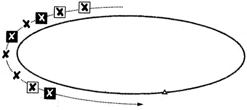 Организация и содержание: группа игроков бежит трусцой вдоль центрального круга, на окружности которого установлена стойка. Группа должна Держаться вместе, хотя тренер может разбить ее на несколько мелких команд, которые надевают цветные разделительные жилетки для выделения отдельных игроков. По мере приближения к стойке тренер дает свисток, и игроки делают ускорение с максимальной скоростью по кругу. Игрок, прошедший стойку последним, выбывает, а группа медленно бежит дальше, затем, достигнув стойки, бежит трусцой на месте и снова ускоряется по свистку тренера. И опять прошедший стойку последним выбывает. Оставшийся игрок становится победителем.