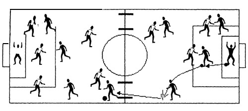 Вместе с тем, все эти тактические действия требуют вы-полнения таких технических приемов как прием и передачи мяча, ведения, обводка, удары по воротам. Выполнение этих приемов — это не что иное, как совершенствование техники. Поэтому отнесение этого упражнения к средствам совершенствования техники также справедливо.
