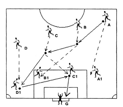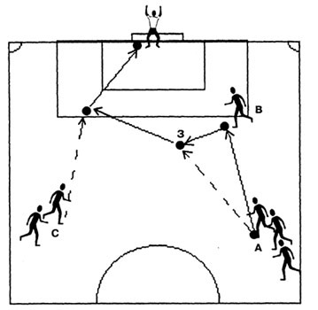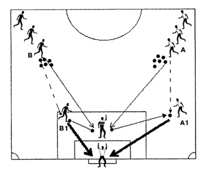 Рис. 4.3. Передачи мяча и удары по воротам после скоростных рывков со «стенкой»