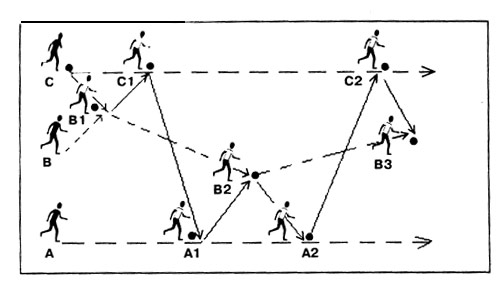 Рис. 4.4. Передача мяча в движении со сменой мест в группе из 3 человек