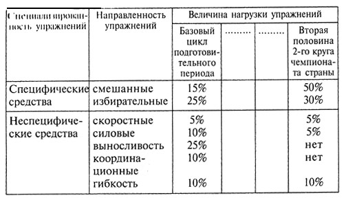 Данные этой таблицы формируются вполне понятным способом. Все футбольные упражнения заносятся в строку «специфические средства», все остальные упражнения — в строку «неспецифические средства». В базовом цикле подготовительного периода объем этих средств составляет 40%, а в конце второго круга чемпионата страны - 80%. В остальных тренировочных циклах года значения этих относительных объемов футбольных упражнений будут лежать в промежутке между этими цифрами.
