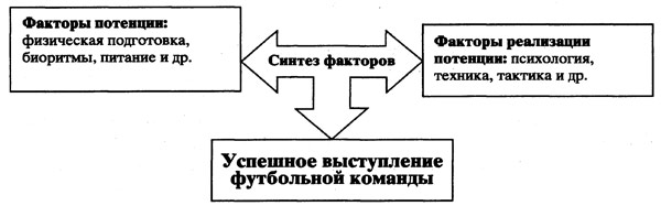 В вышеприведенной схеме, однако, трудно оценить роль психологических факторов, мотивации игрока и ряда других составляющих. В футболе мы предпочитаем выделять: а) факторы потенции; б) факторы реализации потенции (рис.2). К факторам потенции следует относить физиологические возможности спортсмена, в том числе генетически предопределенные способности, уровень тренированности на момент игры, хорошее питание с достаточным восполнением энергоресурсов и микроэлементов, общий уровень восстановления после сыгранных встреч, отсутствие срыва биоритмов и ряд других физиологических составляющих.
