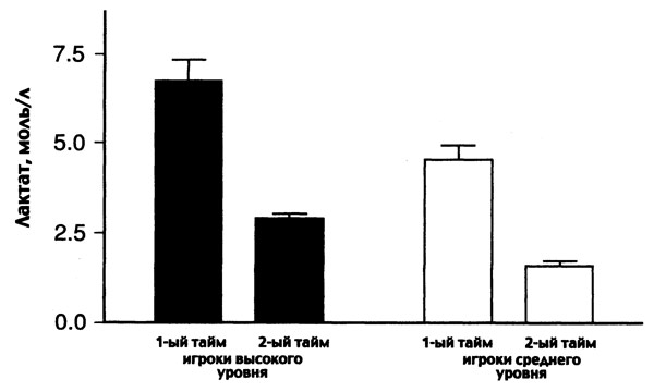 Средняя интенсивность работы, измеренная как процент от максимальной частоты сердечных сокращений (ЧСС шах) в течение 90 минут матча, захватывает уровень анаэробного порога (ПАНО). Напомним, что при интенсивности нагрузки на уровне ПАНО, скорость продукции лактата равна скорости его выведения. Как правило, у футболистов уровень ПАНО соответствует 80—90% от ЧССтах.
