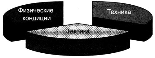 Зарубежные исследователи предлагают выделять три основных составляющих успеха: физиологические возможности, техническую оснащенность футболиста и мастерство строить и реализовывать тактическую модель матча. Каждой из этих составляющих он отводит равную часть в общем успехе (рис.1).