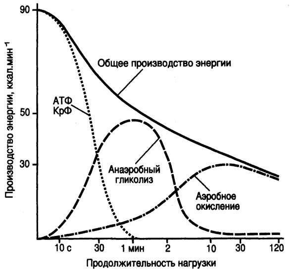e) Самая низкая емкость — запасы АТФ и КФ мышц расходуются за 6—8 секунд работы с максимальной мощностью.