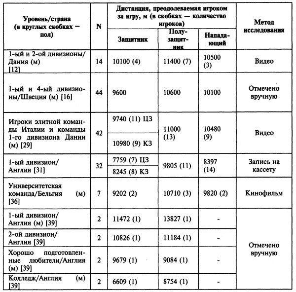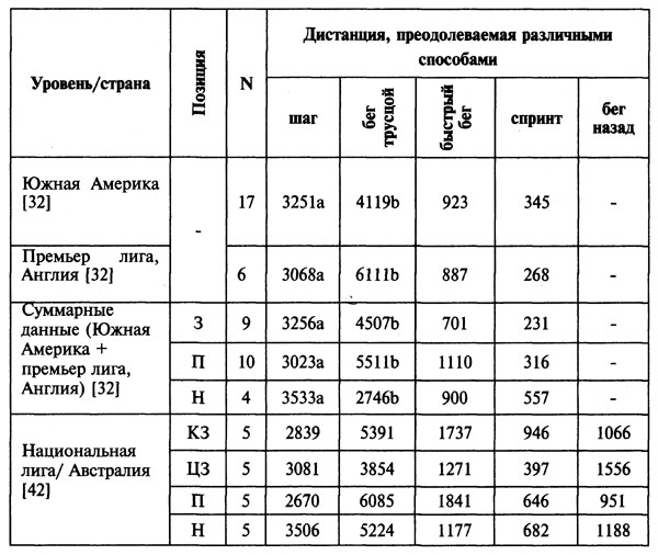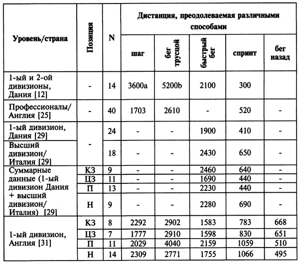 Примечания: N — количество игроков, вошедших в исследование; а — включая ходьбу в обратном направлении; Ъ — включая движение поперек поля и назад; Н — нападающий; ЦЗ — центральный защитник; 3 — за¬щитник; КЗ — крайний защитник; П — полузащитник.