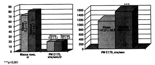 Рис.6. Сопоставление физической работоспособности у молодых и взрослых игроков ведущих команд премьер лиги (2005 г.) по результатам теста PWC 170 (неопубликованные данные; комментарии в тексте)
