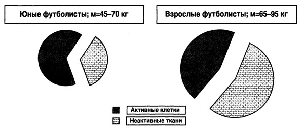 У футболистов-юниоров могут регистрироваться достаточно высокие относительные цифры максимального потребления кислорода в расчете на килограмм веса, сопоставимые со взрослыми игроками. Это связано с особенностями физиологии растущего организма, когда недостаточно высока масса скелета, жировой клетчатки и других тканей, формирующих вес тела, но активно не участвующих в метаболизме. Напротив, удельная масса активно функционирующих клеток развивающегося организма, потребляющих кислород, значительно выше (рис. 6). Однако игроки детского и юношеского возраста имеют недостаточно высокие абсолютные цифры МПК (V02max) в сравнении со взрослыми футболистами.