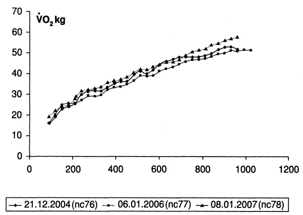 Величину нарастания цифр МПК определяют в основном исходный уровень МПК (V02max), режим и направленность тренировочного процесса. В зависимости от этого, прирост МПК (V02max) (в редких случаях) может достигать 40%. Однако, у хорошо подготовленных спортсменов высокого класса колебания значений МПК (V02max) большей частью не превышают 15% (рис.7).