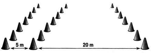 Тест представляет собой прохождение на время специфического, сконструированного норвежскими учеными дриблинг-трека. Относительной новинкой является то, что работа в данном тесте, предназначенном для оценки аэробной работоспособности, выполняется с мячом. За один круг, который затем повторяется, футболист преодолевает расстояние равное в сумме 300 м. Продолжительность выполнения теста составляет 8 минут. Авторы утверждают, что корреляция между преодолеваемым в ходе тестирования расстоянием и максимальным потреблением кислорода, полученным в стендовом эксперименте, является достаточно высокой (г=0,87) (рис. 9).