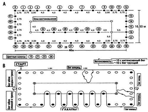 Примечание. Разметка циркулярной зоны для теста Bangsbo (А). Длина и ширина соответствуют размерам штрафной площадки. Зона восстановления разграничена четырьмя маленькими конусами в углах и деревянными досками на поле. Конусы 15 и 39 соответствуют изменениям направления движения, а конусы 21 и 33 — началу и концу слалома. Они должны иметь различный, легко идентифицируемый цвет. Эти четыре конуса в углах области (0, 12, 18, и 36) и конусы слалома (21-33) должны быть, по меньшей мере, высотой 1,2 м. Другие конусы могут быть меньшего размера.