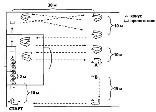 Рис. 9. Специфический футбольный дриблинг-трек для выполнения теста Hoff-Helgerud может использоваться, по утверждению авторов, не только для тестирования, но и для тренировки аэробной выносливости. Бег между метками А и В осуществляется вперед спиной. Высота препятствий составляет, примерно, 20 см. За один круг спортсмен преодолевает дистанцию равную 300 м