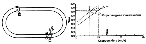 Из таких методов в практике функционального тестирования наиболее широко используется метод Конкони (Concord 1982). Согласно гипотезе Conconi, при прогрессирующем или ступенчатом нарастании мощности выполняемой физической нагрузки, начиная с минимального для спортсмена уровня, в определенный момент нарастание частоты сердечных сокращений отклоняется от прямолинейного; точка изгиба (дефлексии, от англ. deflection) косвенно соответствует уровню лактатного(анаэробного) порога(рис 10; 10.1).