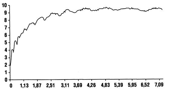 Рис. 15. Пример записи скорости бега на 60 м. На абсциссе — время (с). На ординате — скорость бега (м/с)