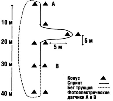 Этот тест широко применяется в футбольной практике и хорошо отражает дистанцию в матче, пробегаемую во время рывковых усилий. Целесообразно регистрировать показатели каждые 10 м дистанции. Для более точной регистрации используются фотодатчики, а сам тест выполняется на футбольном поле в соответствующей спортивной амуниции.
